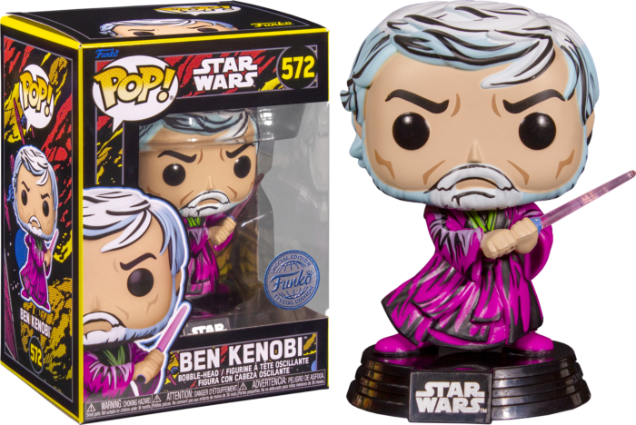 Designed with a wicked neon purple effect, Ben Kenobi stands heroically, his robes billowing around his legs majestically as he raises his lightsaber.